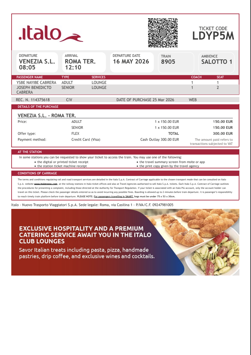 Venice → Rome (Italo Business)May 16 · 8:05 AM · Code: LDYP5M